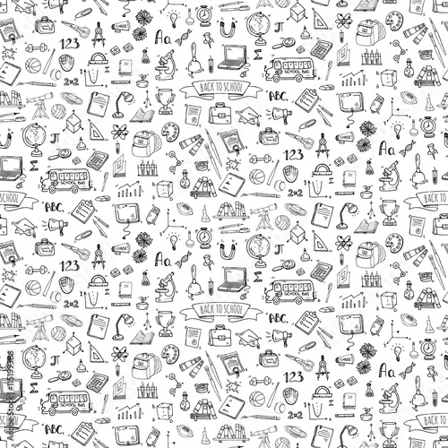 Seamless Background Hand Drawn Doodle Back To School Icon Set Vector Illustration Educational Symbols Collection Cartoon Various Learning Elements Laptop Lunch Box Microscope Telescope Sketch Bus Stock Vector Adobe Stock