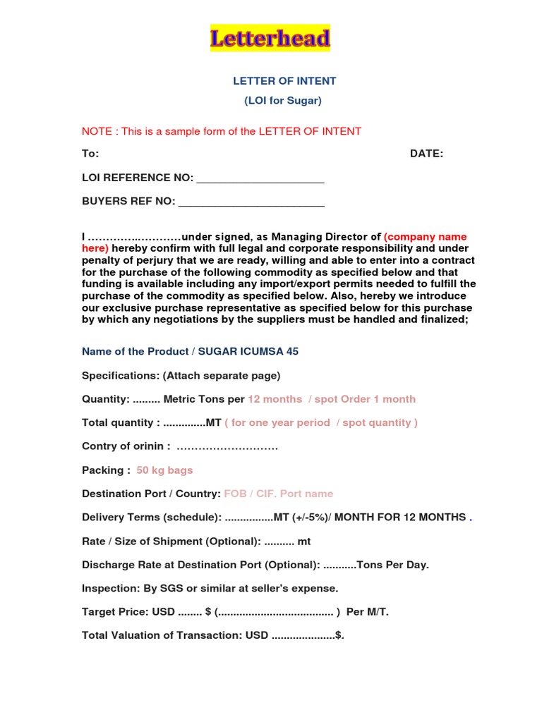 Sample Letter Of Intent To Purchase With Examples